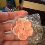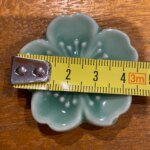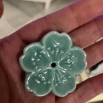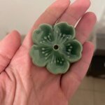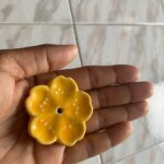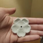 Cute flower-shaped earthenware incense holder. Received in good condition and on time. There is a default leger on a petal (if we shit….). The color is plus clear as expected… be careful to put the article on sand or other to be able to sting a incense through!